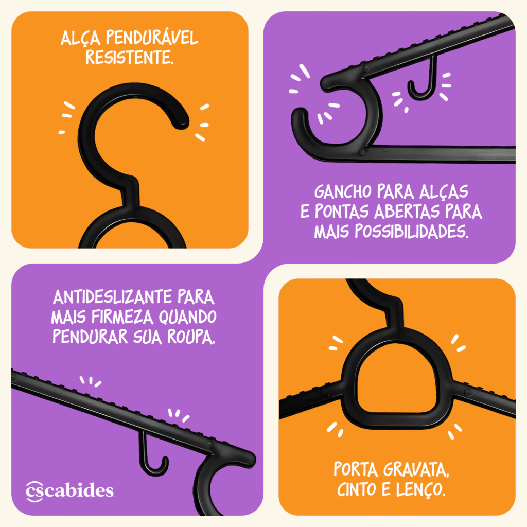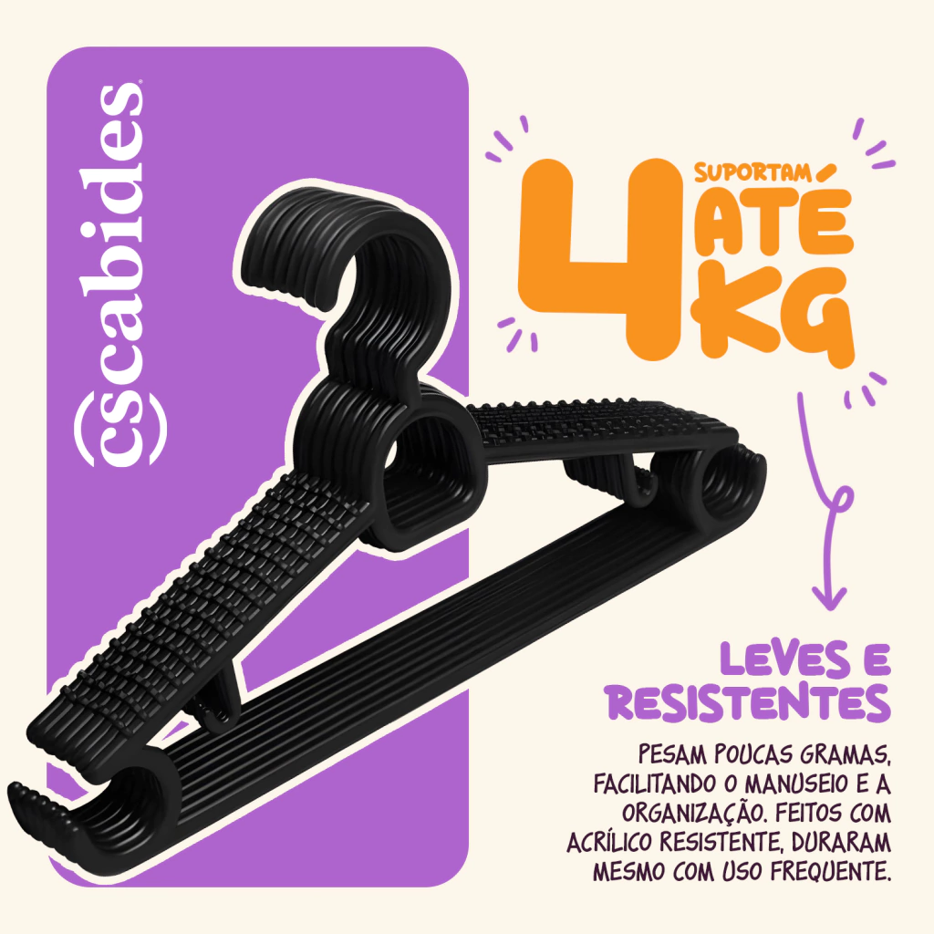 Os Cabides Eco Pretos Infantil Antideslizantes Reforçados da marca Cs Cabides tem alças que impedem as roupas de caírem e ficarem amassadas, perfeito para organizar o guarda-roupa do seu filho(a).